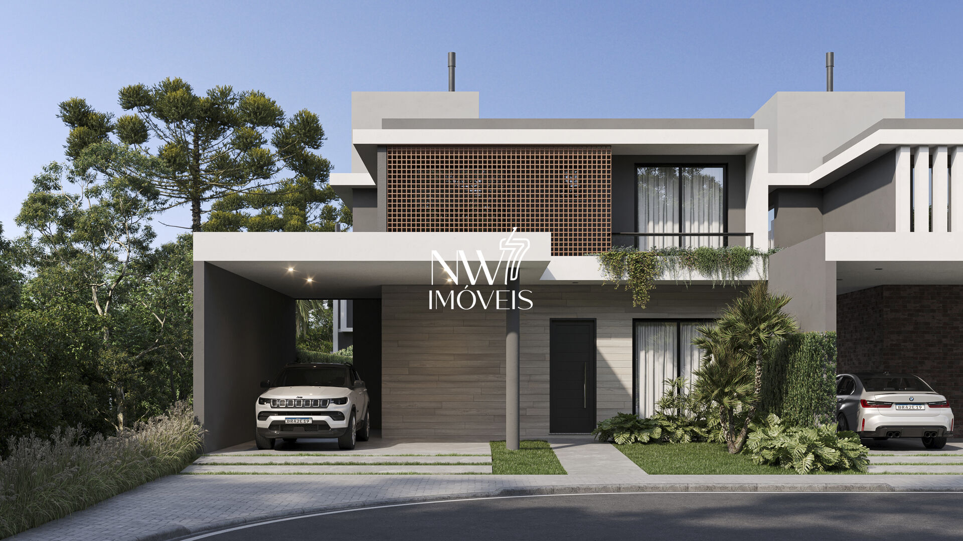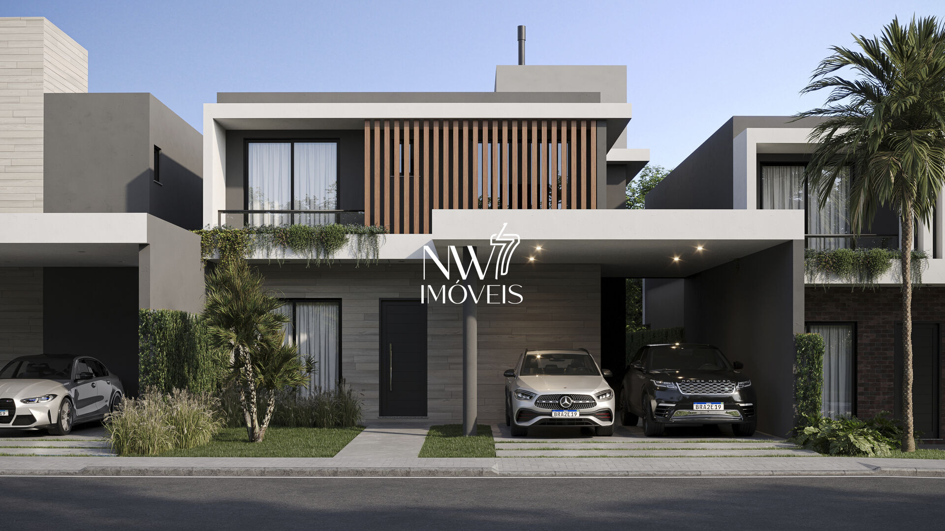 Fachadas das casas com paisagismo exuberante.