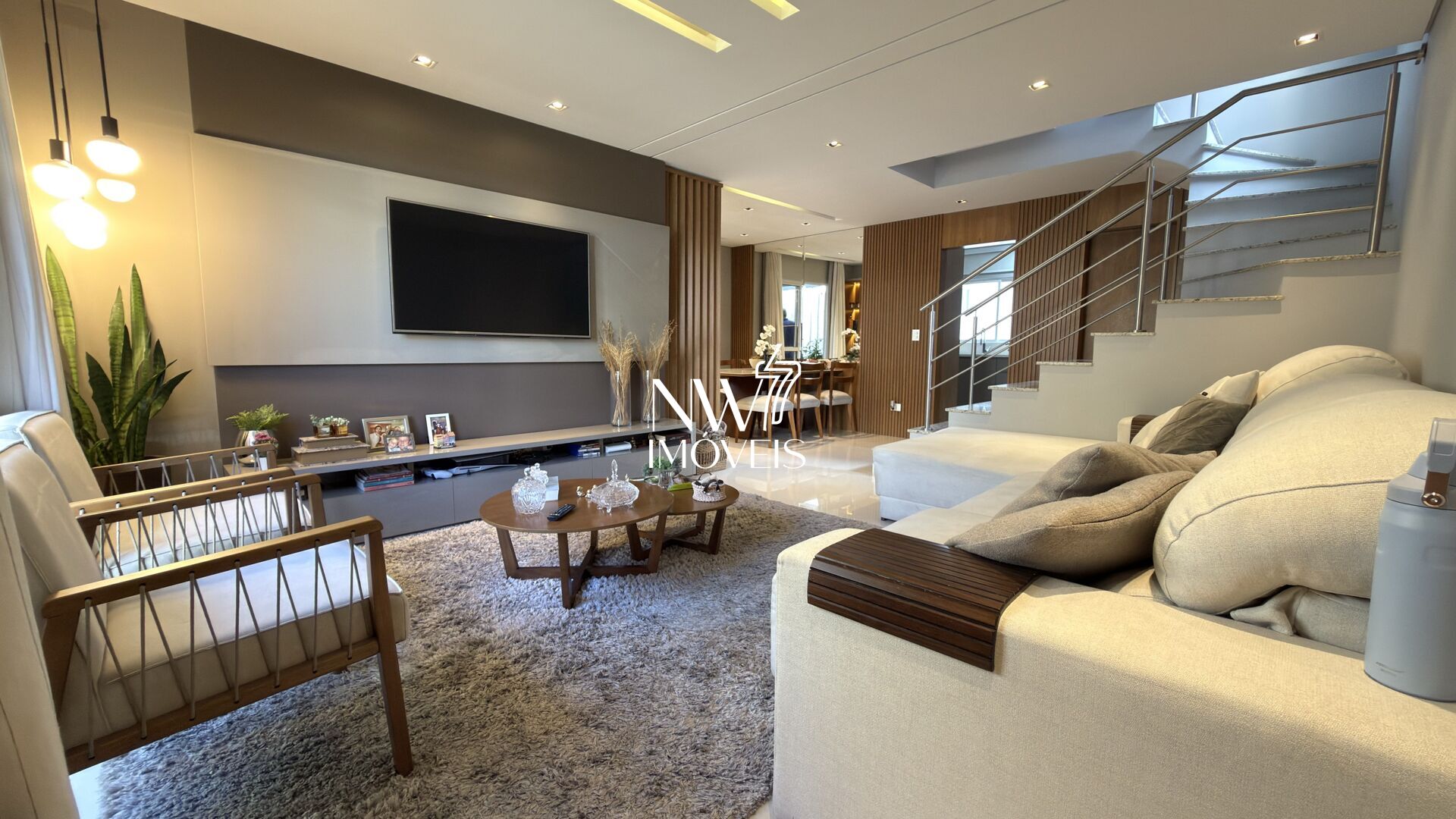 A sala espaçosa, com dois ambientes e decoração refinada, integra-se de forma natural ao espaço gourmet acolhedor, que se conecta ao jardim, criando um cenário perfeito para momentos especiais com amigos e familiares.