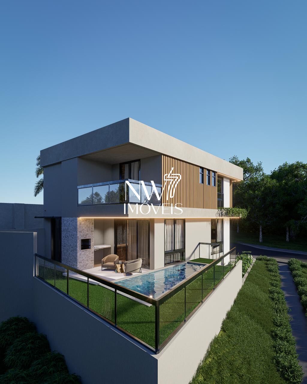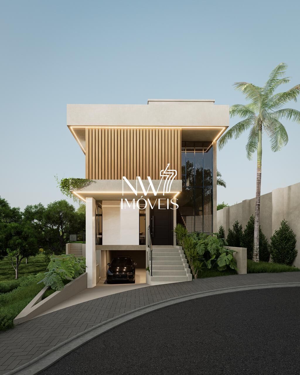 Com 275 m² de área privativa, esta casa se destaca por sua arquitetura moderna, linhas retas, volumes bem definidos e uma fachada imponente que combina concreto aparente, ripado vertical e amplos panos de vidro, proporcionando elegância, iluminação natural e integração com o paisagismo.